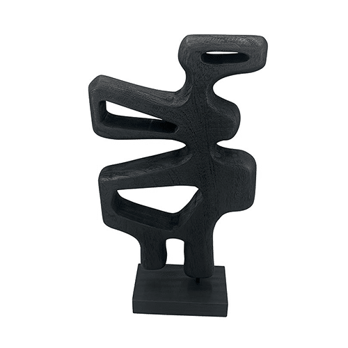 Sculpture décorative stylisée en bois ajouré noir sur base en bois.